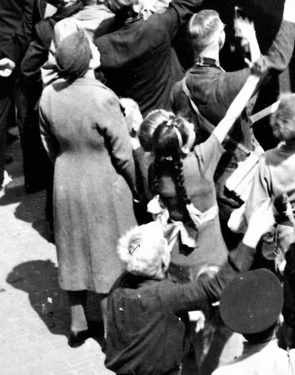 Het was begin mei 2022 dat de Stichting Historische Kring Bodegraven een expositie had samengesteld met als titel "Bodegraven, Oorlog en Bevrijding". Aangezien de vroegere jeugd van mijn moeder zich afspeelde gedurende de periode 1940-1945, leek het een goed idee om dit evenement gezamenlijk te bezoeken. Zo gezegd, zo gedaan. Na aankomst in het Groene Harthuys in de Bouwsteeg n Bodegraven werden enthousiast de foto's bekeken die op allerlei grote en kleine panelen waren aangebracht. Het duurde niet lang totdat een mij bekende stem vanachter één van de panelen uitriep: "Hé, daar sta ik". Het bleek dat mijn moeder een foto had ontdekt die was gemaakt in de Brugstraat in Bodegraven tijdens de intocht van de Canadezen op 9 mei 1945. Zij was als toeschouwertje aanwezig en werd daarbij toen toevallig ook gefotografeerd. Een uitsnede uit deze foto waarop mijn moeder (Teuni Boele), als een toen 10-jarig meisje samen met haar moeder (mijn oma Boele) en daar tussenin nog net zichtbaar haar 6-jarige broertje (mijn oom Wim Boele) te zien zijn, treft u hier links aan. Ze is het ook echt onmiskenbaar: moeder Teuni met de 2 kenmerkende lange vlechten op haar rug. De volledige foto vindt u hieronder. Verder is het nog leuk om hierbij te vermelden dat de bewuste foto ook als omslagfoto is gebruikt op het boekje "Bodegraven in oorlogstijd" van Cock Karssen uit 1985. |